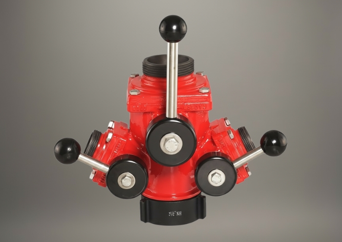 These devices are designed to distribute hose lines for various firefighting operations. They are specially designed to allow shut-off by means of integral ball valves at the outlets, allowing the operator to work with one or more hoses. These valves close on a Teflon seat, ensuring smooth operation and perfect sealing.