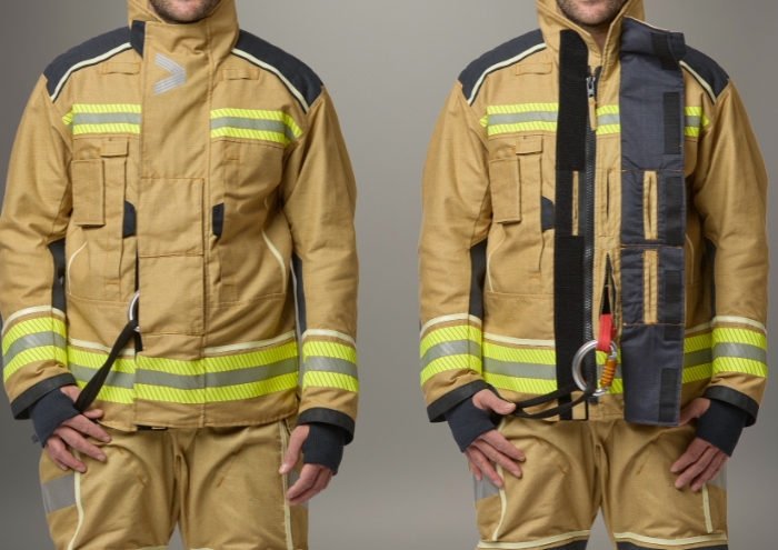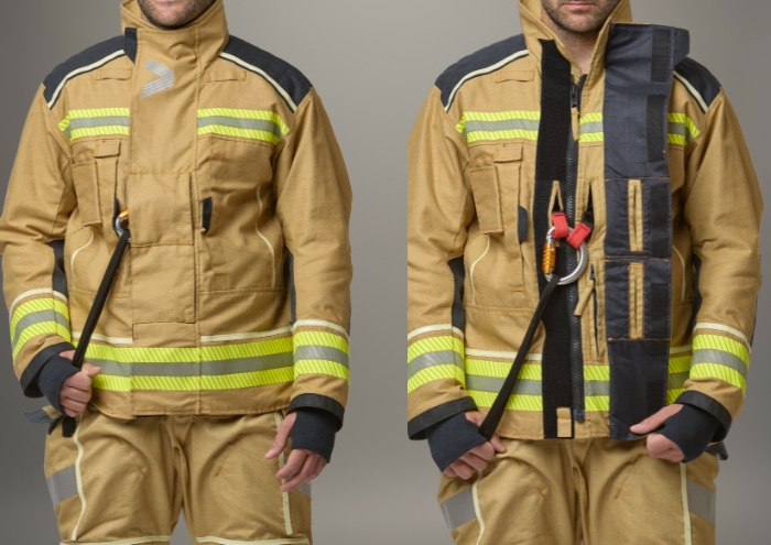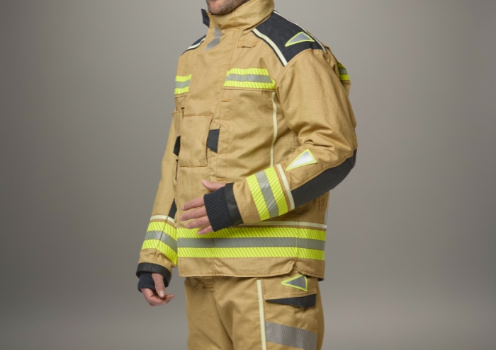 2/4-length jacket, body constructed with a front and back yoke with two front and one back panel. The back panel is constructed with two symmetrical side pleats. Sleeves with pre-shaped elbows and gusseted underarms are ergonomically designed for fire service work.