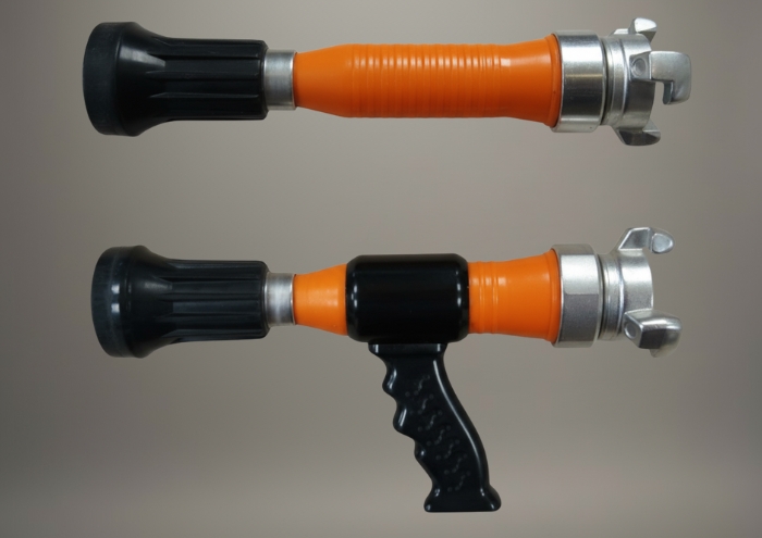 Constant flow fire lances, with easy continuous adjustment of effects: shut-off, direct jet, spray and mist, by rotating the lance head from 0° to 120°.