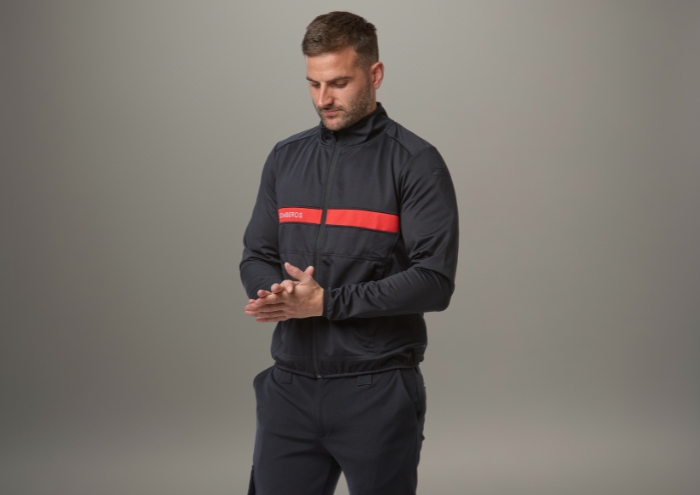 Navy blue fleece jacket with ergonomic fit cut on both sides, both front and back.