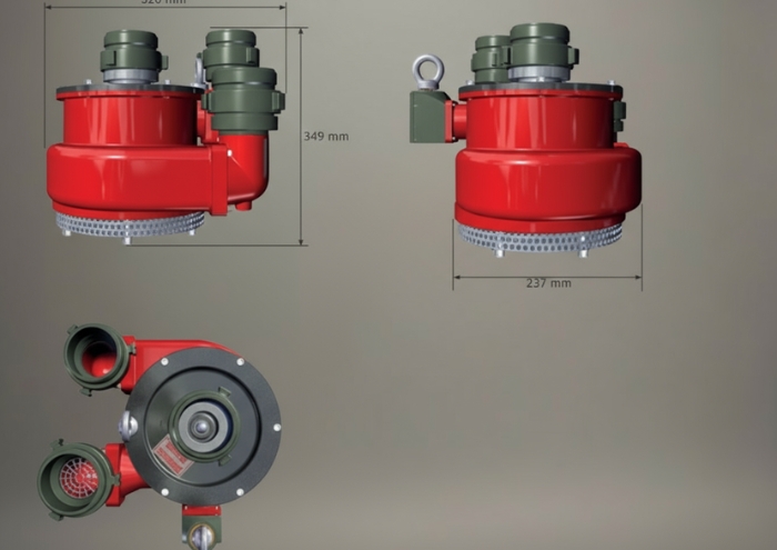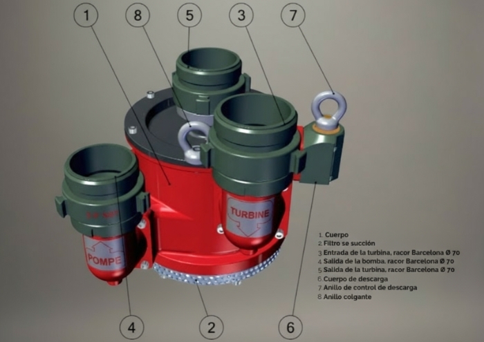 It is designed to perform rapid and safe pumping and transfer operations. The machine operates through a closed water circuit driven by the turbine, which in turn transmits the motion to a second turbine connected to a shaft, which then evacuates the water to be transferred or pumped out. The turbopump is operated by a 70 mm diameter hose connected to the pump outlet of a fire truck or pumping unit; a second hose returns the clean water to the tank of the truck or pumping unit, without wasting any water. The liquid to be evacuated will exit through a third hose and will never mix with the water from the pumping source. It continues to operate without problems even when dry.