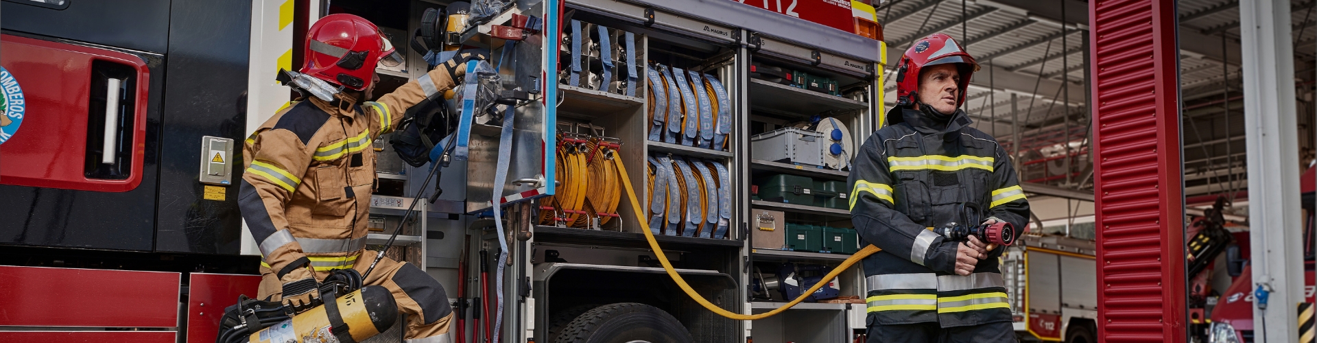 Extinguishing a forest fire with firefighting equipment and hoses deployed