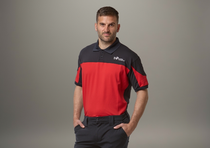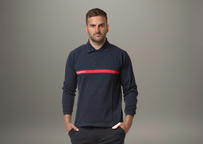 Polo de manga larga o manga corta en azul marino con banda en color rojo en pecho y espalda. Bordado BOMBEROS en blanco en el interior de la banda o el texto que se desee. Se podrá colocar